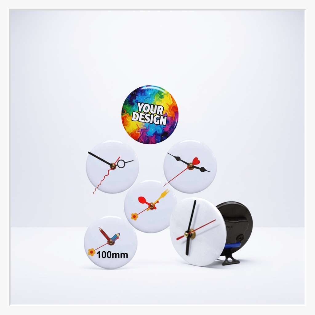 Machen Sie Ihre Zeit zu einem Unikat. Unsere 100 mm Buttonuhr ist weit mehr als nur ein Zeitmesser – sie ist ein personalisiertes Designobjekt für Ihren Schreibtisch, Ihr Regal oder Ihre Wand. Auf der gewaltigen Fläche von 10 cm Durchmesser kommt Ihr individuelles Motiv perfekt zur Geltung, während das präzise Uhrwerk zuverlässig die Stunden zählt.
