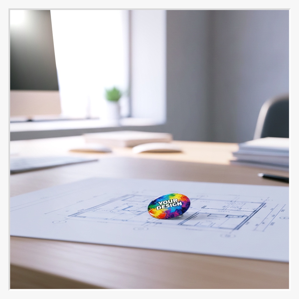 Die Besonderheit dieses 37 mm Modells ist die solide Metallrückseite. Der kleine Neodym-Magnet ist fest in die Platte integriert, was für eine außergewöhnliche Langlebigkeit und eine wertige Haptik sorgt. Trotz der Metall-Konstruktion bleibt der Button ein Leichtgewicht und fixiert Ihre Notizen sicher an Whiteboards oder Design-Kühlschränken.