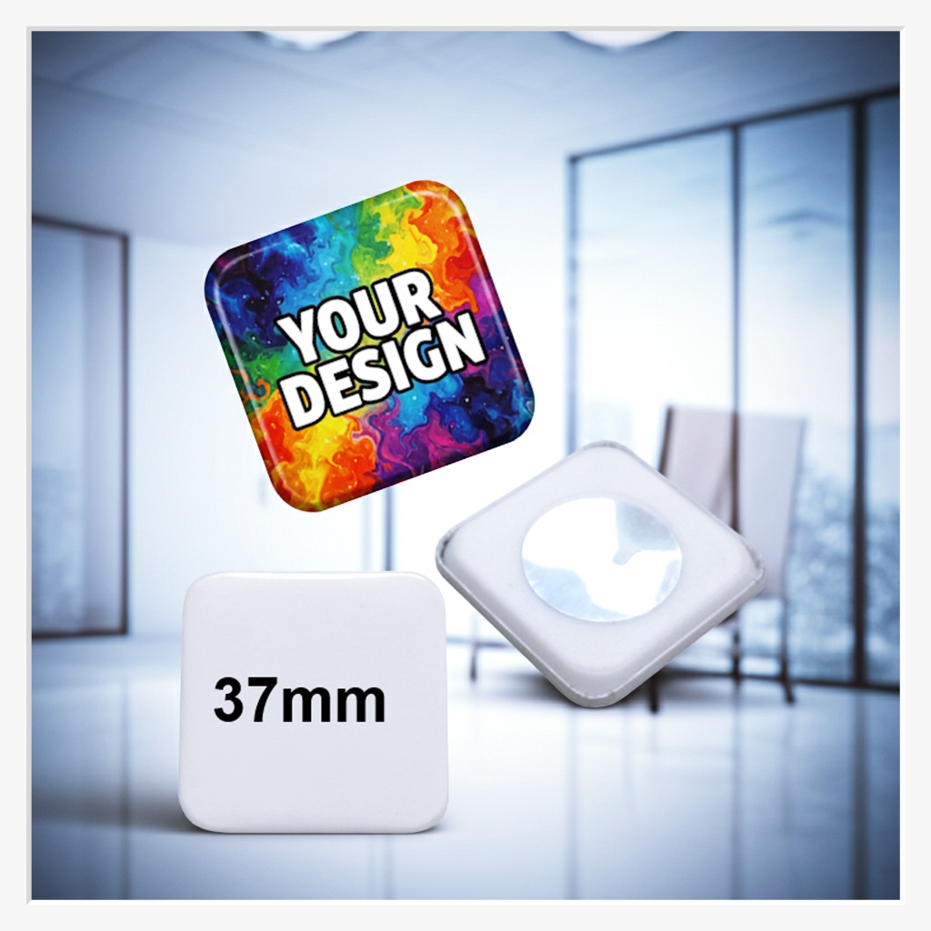 Die Besonderheit des quadratischen 37 mm Modells liegt in seiner modernen Formensprache. Er fügt sich nahtlos in strukturierte Umgebungen ein und bietet dabei genug Raum, um Ihre Botschaft klar und deutlich zu präsentieren. Der kleine, aber leistungsstarke Neodym-Magnet auf der Rückseite ist zusätzlich mit einer Schutzfolie abgedeckt, um die Haftkraft zu optimieren und Oberflächen zu schonen.