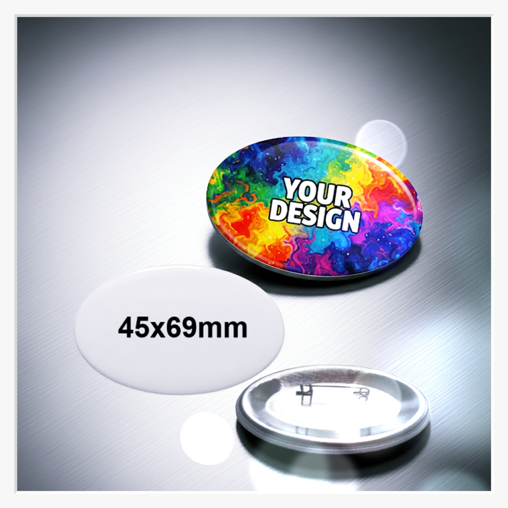 Manchmal muss es etwas Besonderes sein. Unser ovaler 45x69 mm Button bricht mit den Sehgewohnheiten und bietet eine außergewöhnlich elegante Optik. Durch seine gestreckte Form wirkt er dynamischer als ein runder Button und bietet gleichzeitig eine exzellente Fläche für Logos und Schriftzüge im Querformat. Er ist der „Geheimtipp“ für exklusive Events, edles Branding oder als stilvolles Accessoire mit Vintage-Charakter.