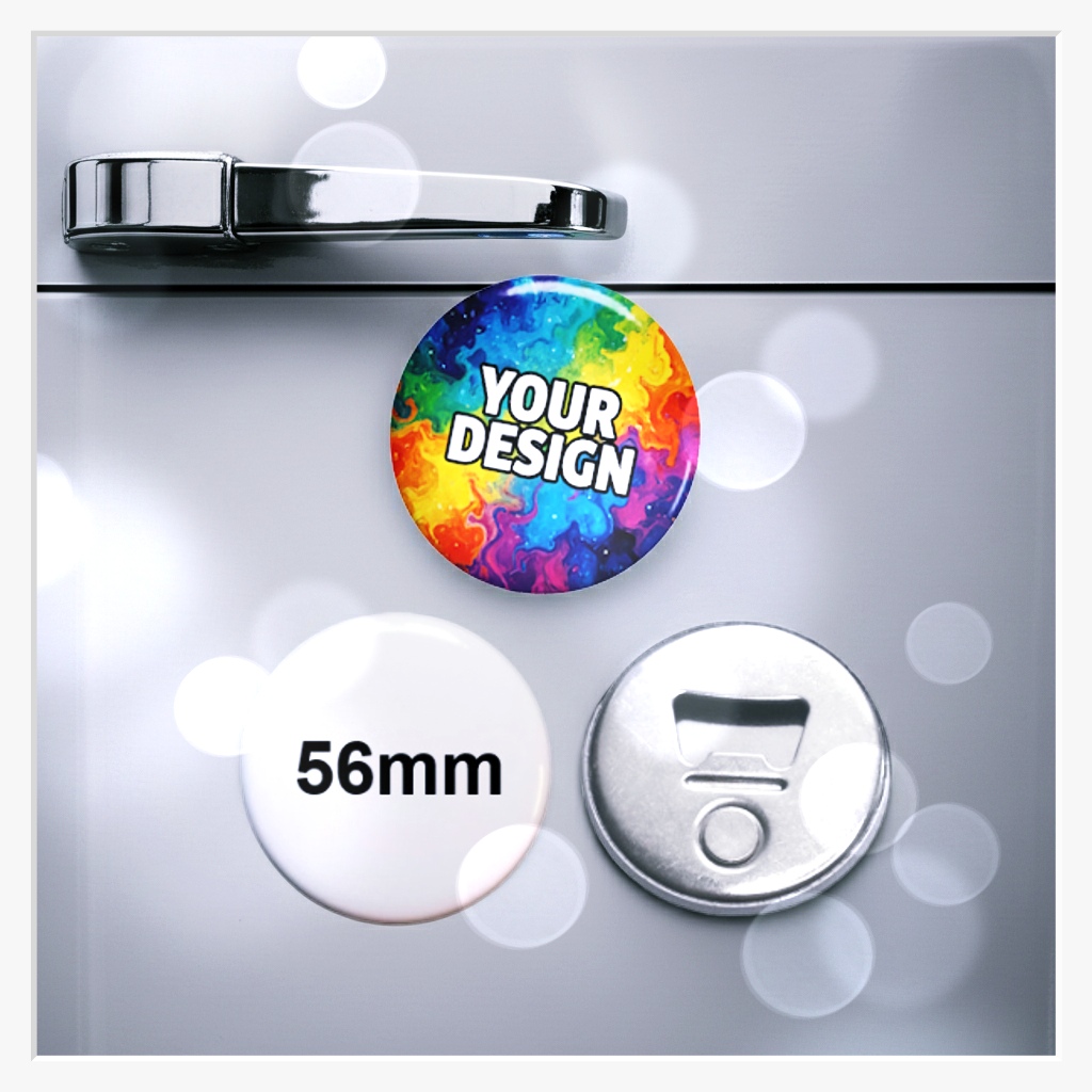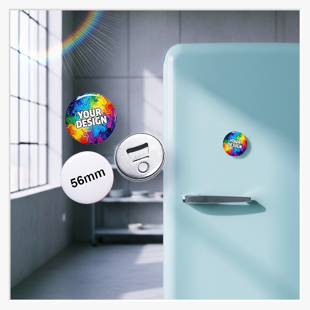 Warum sich zwischen einem Magneten und einem Flaschenöffner entscheiden? Mit einem Durchmesser von 56 mm bietet dieser Button die ideale Größe für Ihre Urlaubsfotos, Firmenlogos oder humorvolle Sprüche. Dank des starken integrierten Magneten haftet er zuverlässig an allen metallischen Oberflächen – vom modernen Edelstahl-Kühlschrank bis zum charmanten Retro-Modell. So bleibt Ihr Logo oder Ihr liebstes Motiv immer im Blickfeld und ist genau dort zur Stelle, wo die Flaschen geöffnet werden.