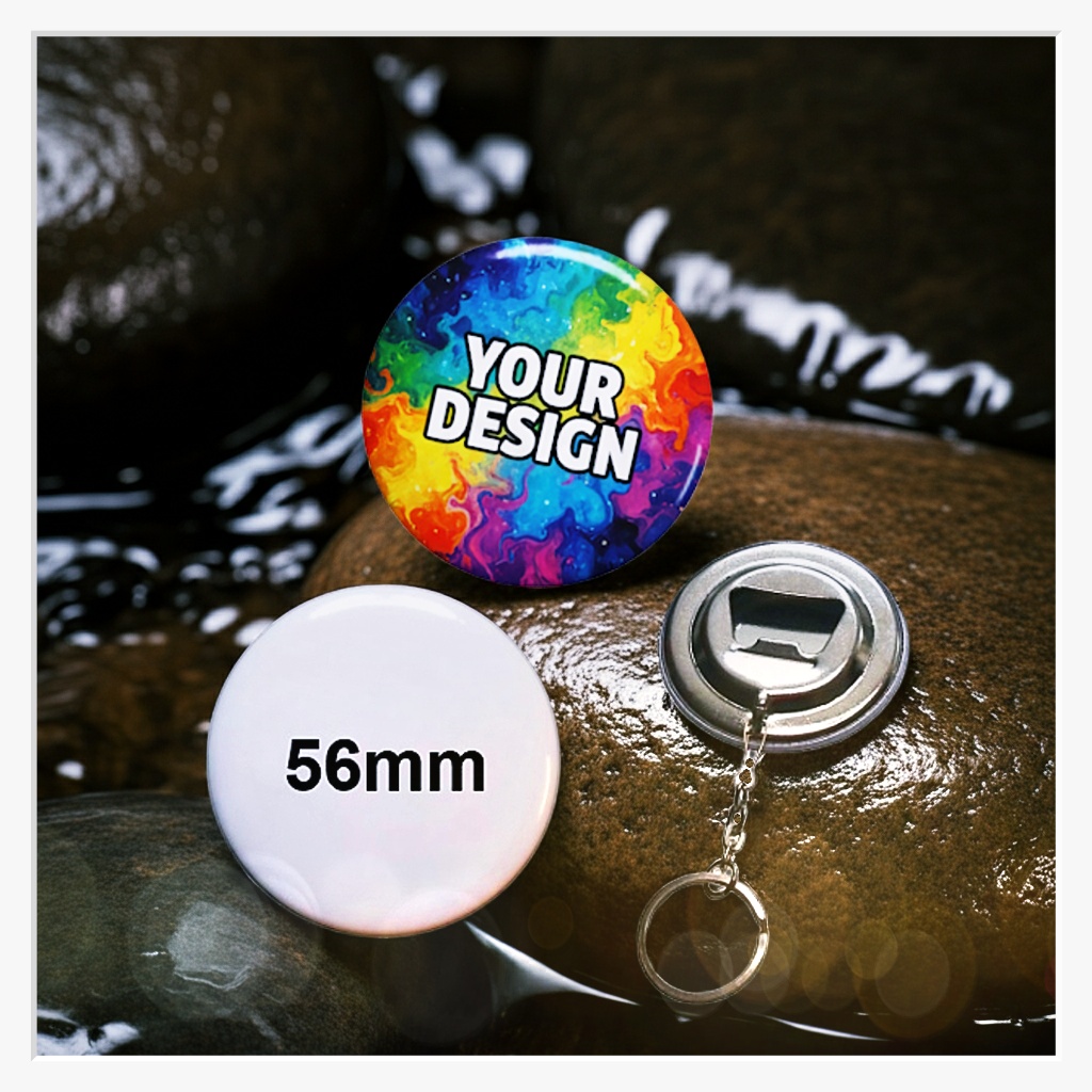 Größer, robuster, auffälliger: Unser 56 mm Button-Schlüsselanhänger mit Flaschenöffner ist das Flaggschiff unter den funktionalen Werbeträgern. Dieses Format bietet die perfekte Bühne für Botschaften, die gesehen werden wollen. Dank des integrierten Kapselhebers auf der Rückseite und des stabilen Schlüsselrings ist er der Retter in der Not auf jeder Party und gleichzeitig ein ständiger Botschafter Deiner Marke.