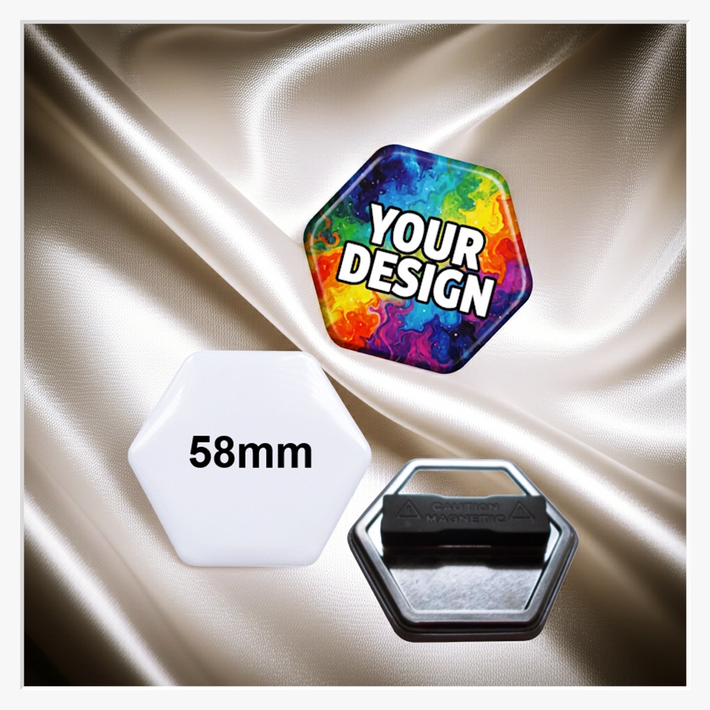 Ein unverkennbares Statement in moderner Wabenform: Unser 58 x 65 mm Hexagonal-Button mit Doppel-Textilmagnet ist die ideale Wahl für ein innovatives Branding, das aus der Masse hervorsticht. Die sechseckige Form bietet eine architektonisch ansprechende Fläche für Logos und grafische Konzepte. Dank des verstärkten Doppel-Magnetsystems wird der Button an zwei Punkten fixiert, was ein Verrutschen oder Verdrehen an der Kleidung ausschließt – ganz ohne Nadelstiche.