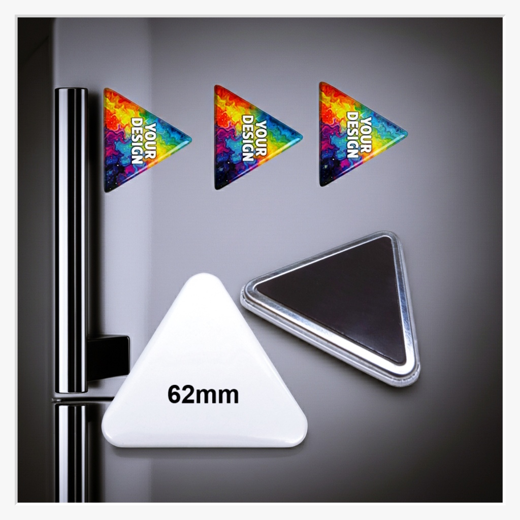 Setzen Sie ein Zeichen, das garantiert auffällt. Unser dreieckiger 62x67 mm Button mit Kühlschranksoftmagnet ist die perfekte Wahl für alle, denen Standardformate zu gewöhnlich sind. Die markante Dreiecksform bringt eine völlig neue Dynamik an Ihre Magnetwand oder Ihren Kühlschrank und bietet eine außergewöhnliche Bühne für moderne Layouts – bei gleichzeitigem Schutz des Untergrunds.
