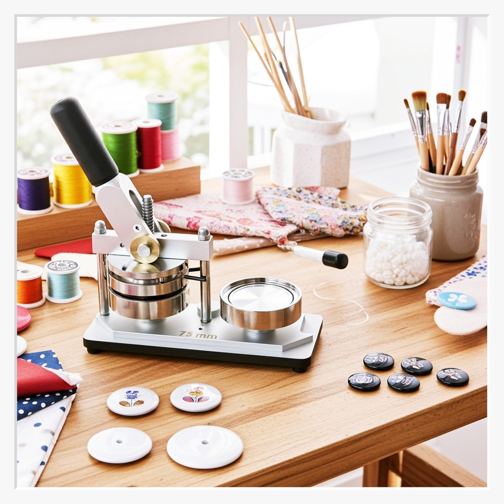 - Material-Kompatibilität: Verwenden Sie für optimale Ergebnisse unsere originalen 75 mm Buttonrohlinge, die exakt auf die Toleranzen dieser Maschine abgestimmt sind.