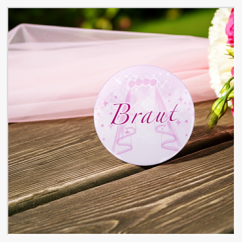 1x Button "Braut": Mit pinkem Schleier-Motiv und passender Schrift.