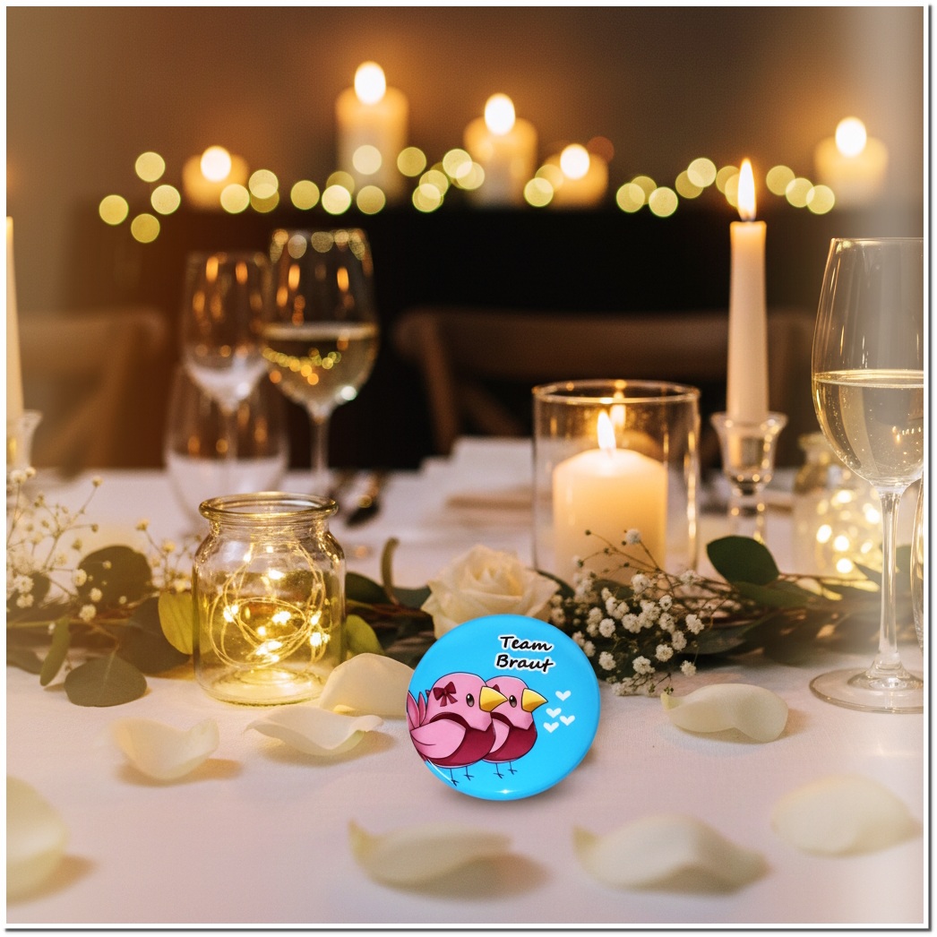 Im Komplettset ist an alle gedacht: Die künftige Braut erhält ihren ganz eigenen „Braut“-Button, während die 11 Begleiterinnen mit dem „Team Braut“-Button ausgestattet werden. Dank der klassischen Nadel auf der Rückseite lassen sich die Anstecker blitzschnell an Shirts, Jacken oder Taschen befestigen.